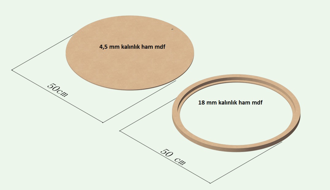 - Malzeme: Kasnak kısmı Yüksek kaliteli 18 MM Ham MDF. Arka kısmı 4,5 MM HAM MDF .